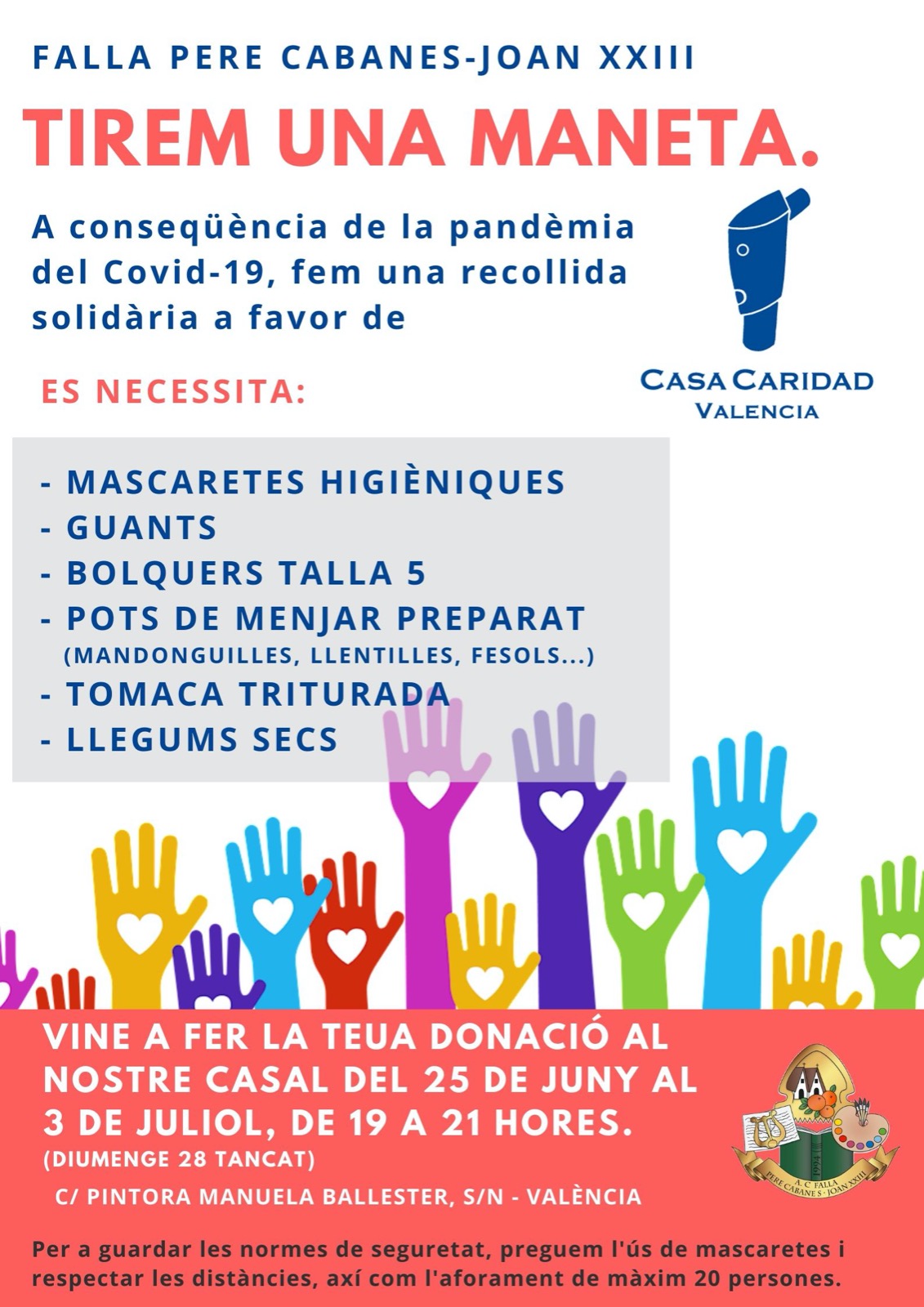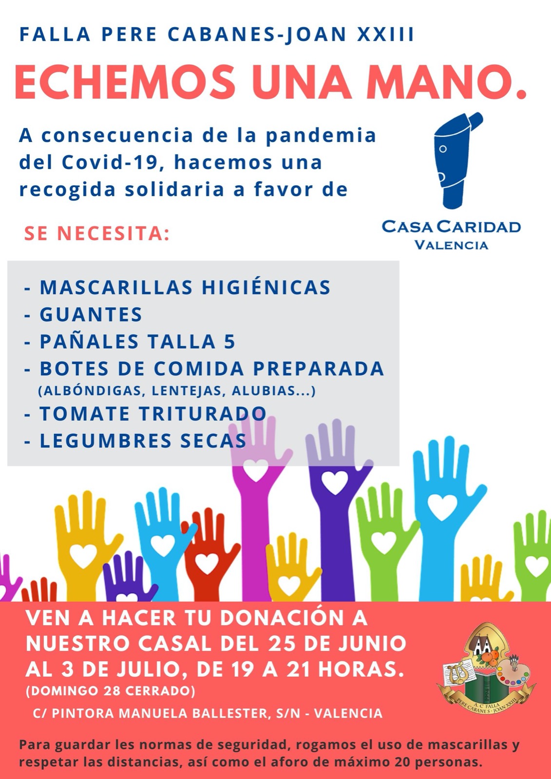 Hemos pasado una situación excepcional y es el momento de ayudar a quien realmente lo necesita. Por eso, desde nuestra comisión hemos puesto en marcha la campaña “Echemos una mano”/”Tirem una manera”, con la que pretendemos hacer una recogida solidaria, que ayude a los que más han sufrido y siguen afectados, de una manera u otra, la pandemia del Covid-19.