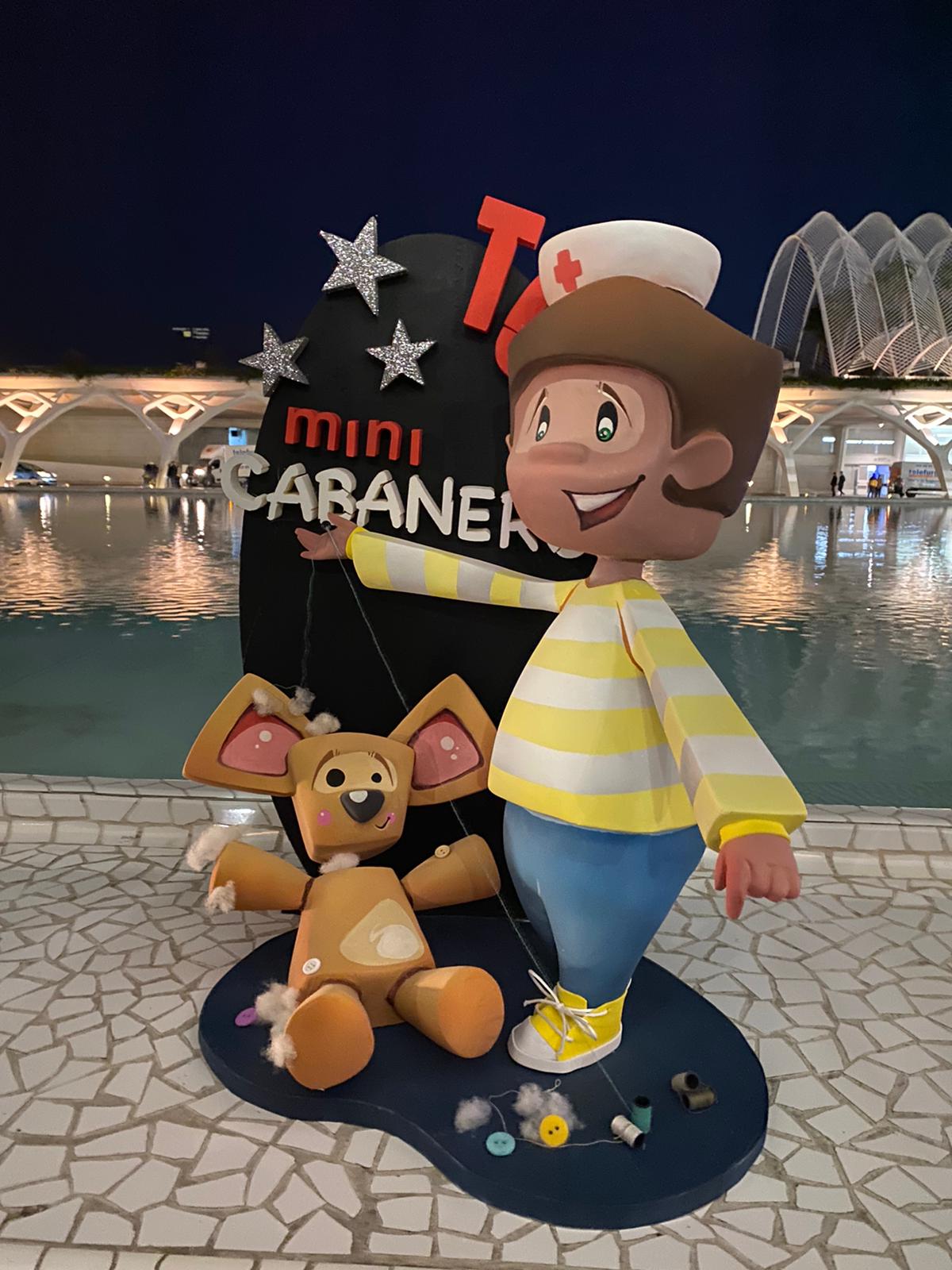 ‘Llibertat per a jugar’ és nostra falla infantil, i este xiquet vol ser comare, i per això vol estudiar infermeria, i el podrem vore cosir el seu joguet a esta tendra escena. Santi Muñoz signa nostra falla infantil d’enguany.